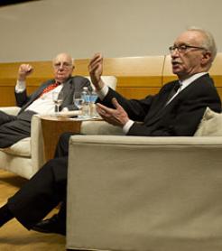 Federal Reserve Chairman Paul Volcker and Prof. William Silber autograph copies of the new biography, "Volcker: The Triumph of Persistence."